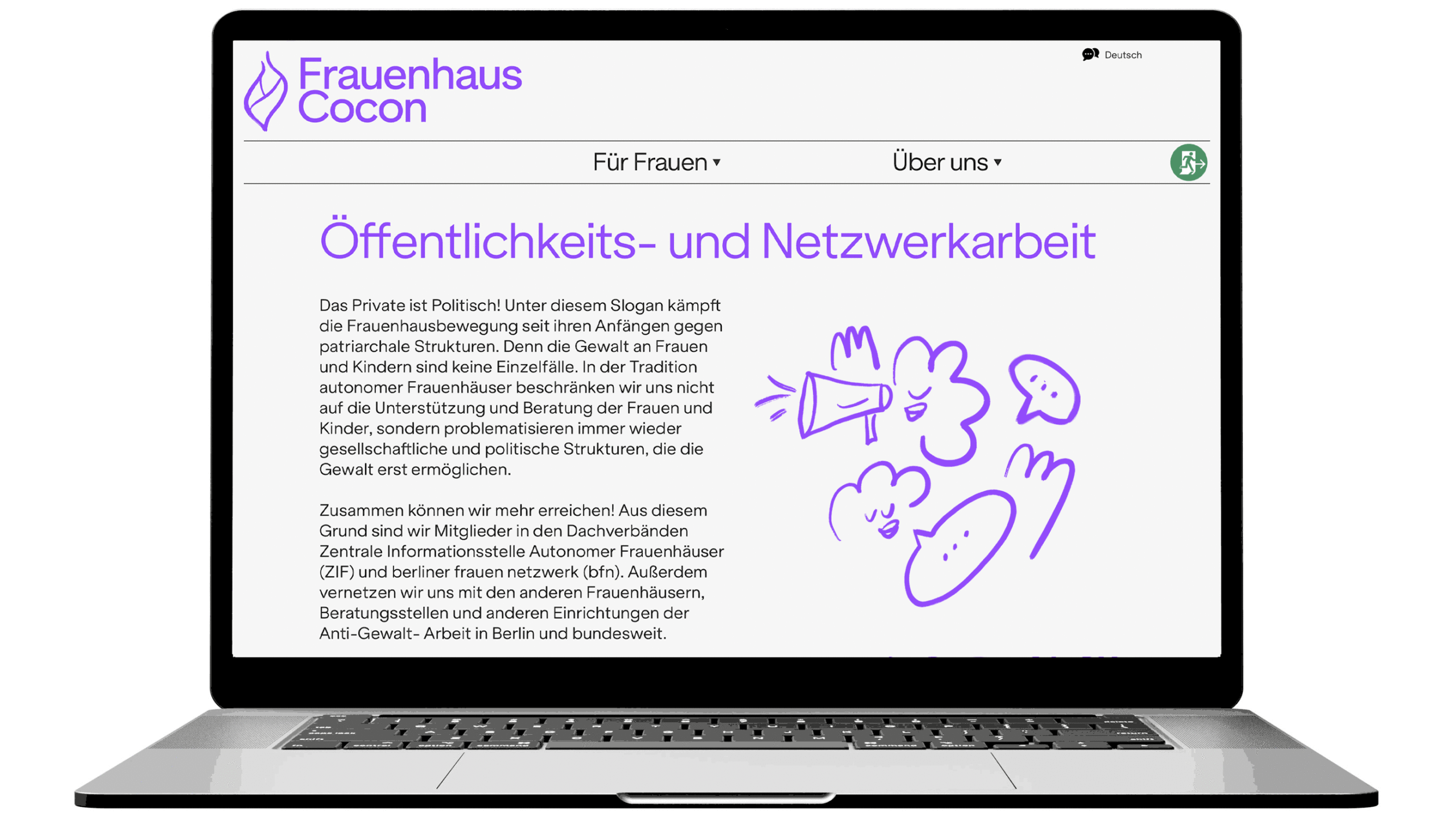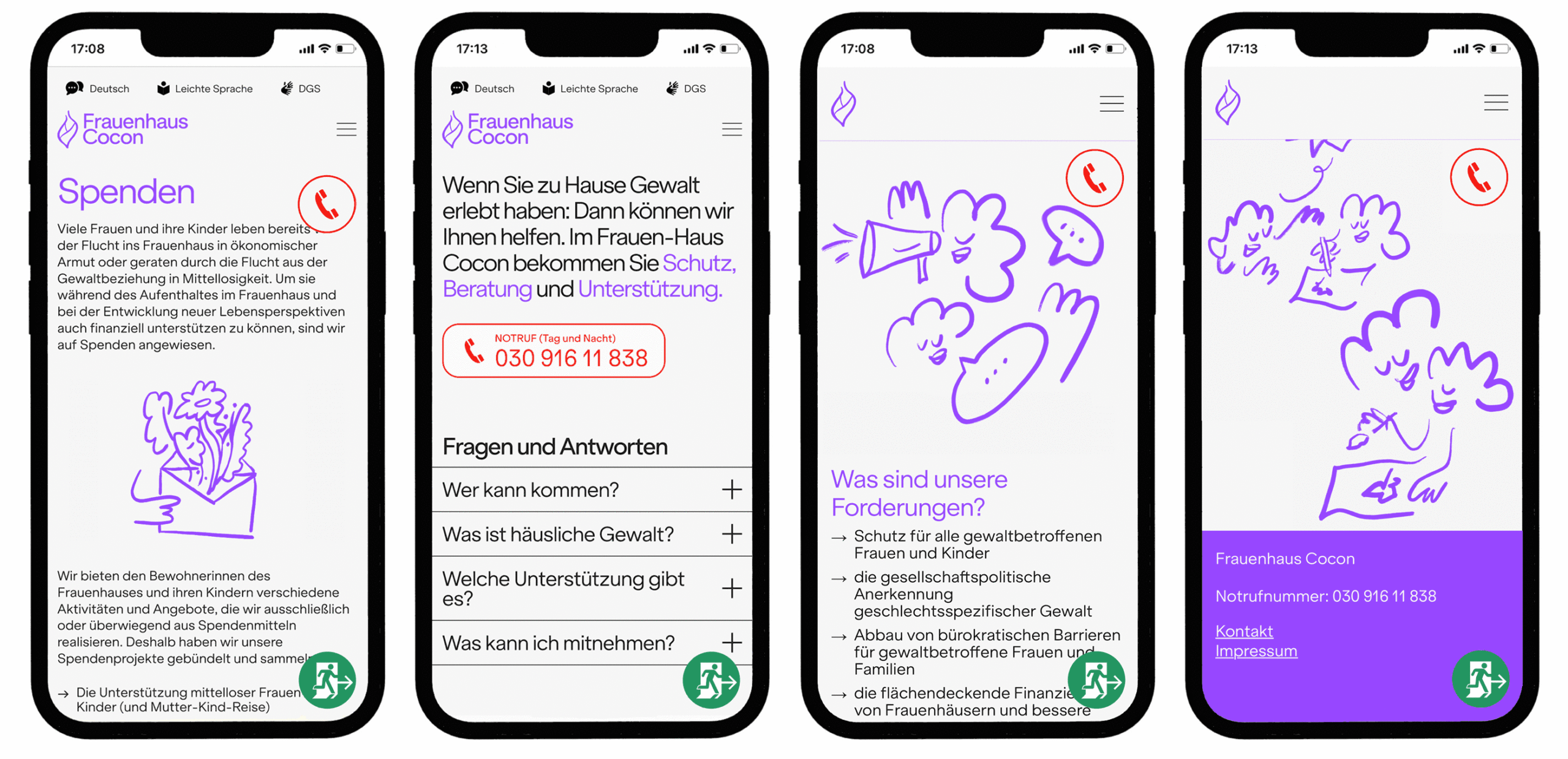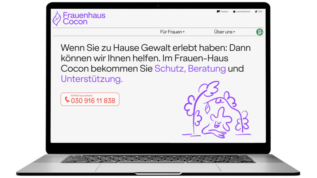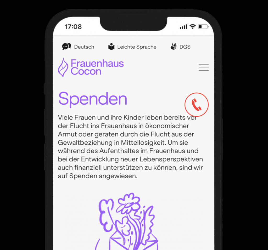 For added safety, we integrated a sticky “Exit”-button. With one click or tap, the site redirects to Google, blocking the back function to prevent traces of the visit. This ensures quick, discreet escape in potentially dangerous situations. Also the site’s wordmark “Frauenhaus Cocon” fades out when scrolling down, making it less identifiable at a glance.