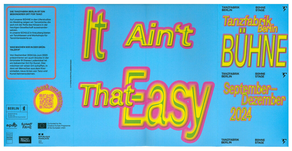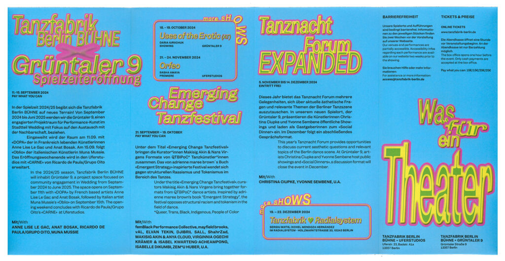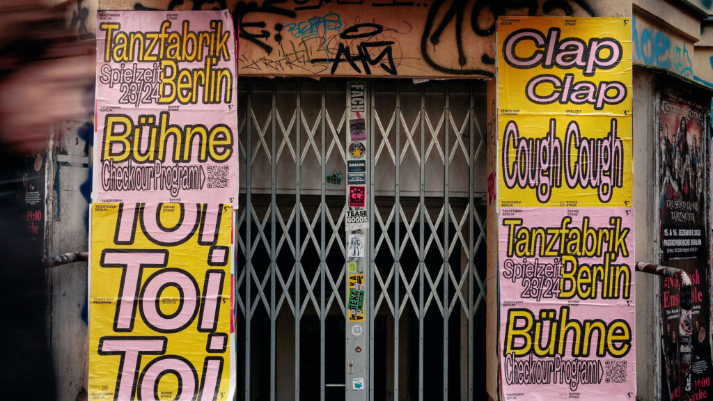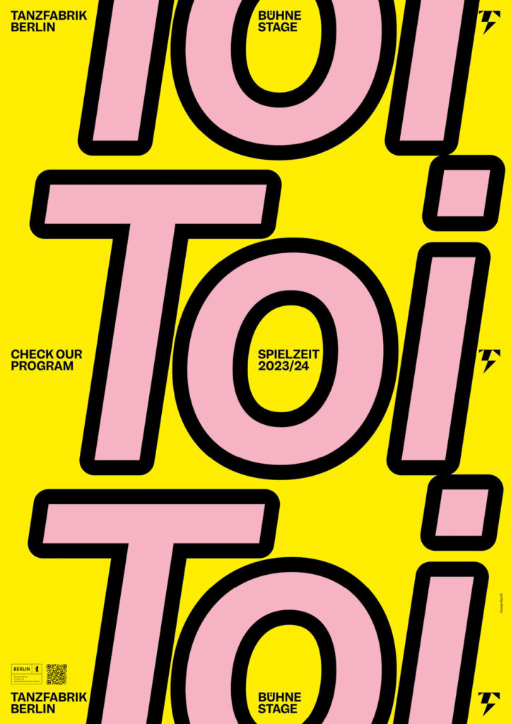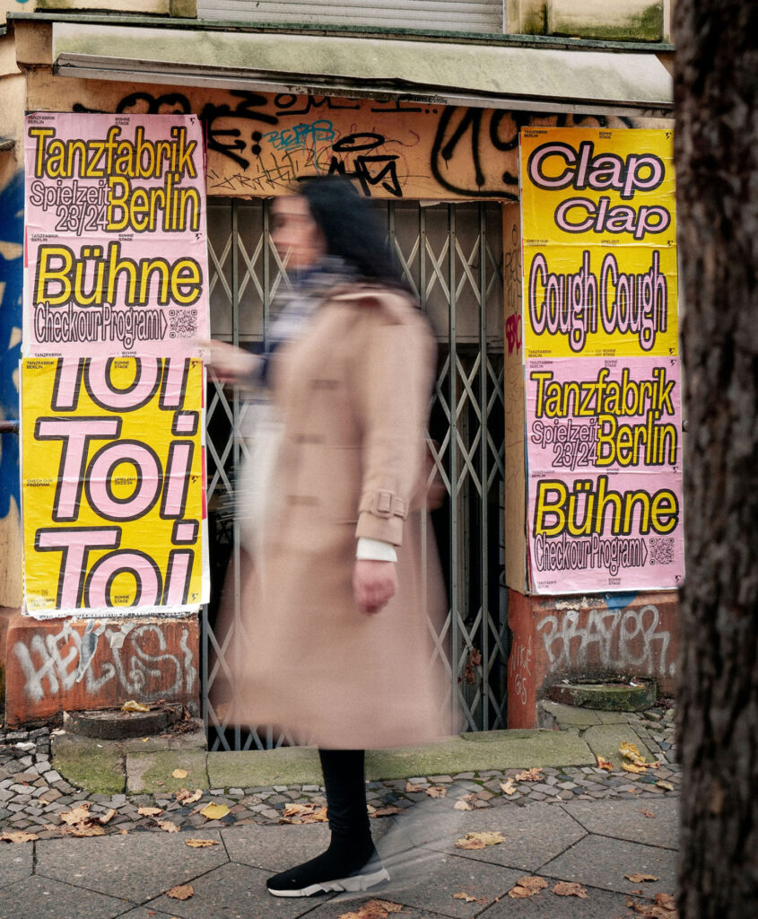 BackgroundEach Spielzeit we transform sound, movement and cultural moments into typographic statements that serve as both poster and performance. Onomatopoeia, ironic phrases or politically charged slogans become key visuals – in ever-evolving typographic styles and colour schemes – so that each new season feels like a fresh choreography. This flexible visual system allows each season to speak its own voice while remaining unmistakably Tanzfabrik. Bold, expressive, contemporary.